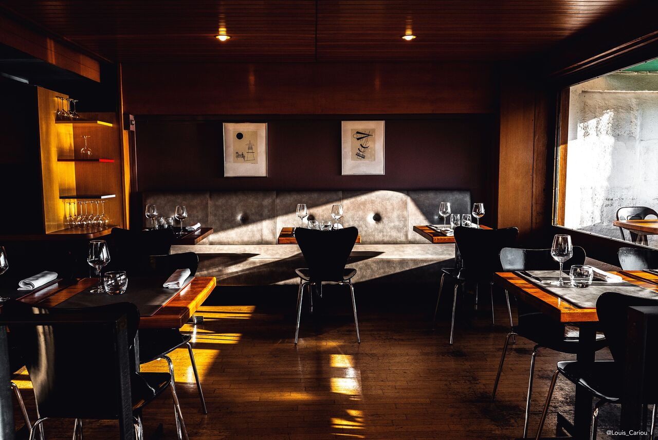 La salle de restaurant  avec sa double hauteur, son mélange de bois blond et de marbre gris, ses tables Charlotte Perriand, ses chaises scandinaves ; ses lampes « Laroche » Le Corbusier et  « Pipistrelle » d’Aulenti.